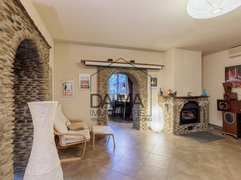 Il piano inferiore custodisce uno degli ambienti più affascinanti della proprietà: una grande taverna con salone e camino, angolo cucina e bagno, lo spazio perfetto per cene conviviali, momenti di svago e incontri con amici e parenti.