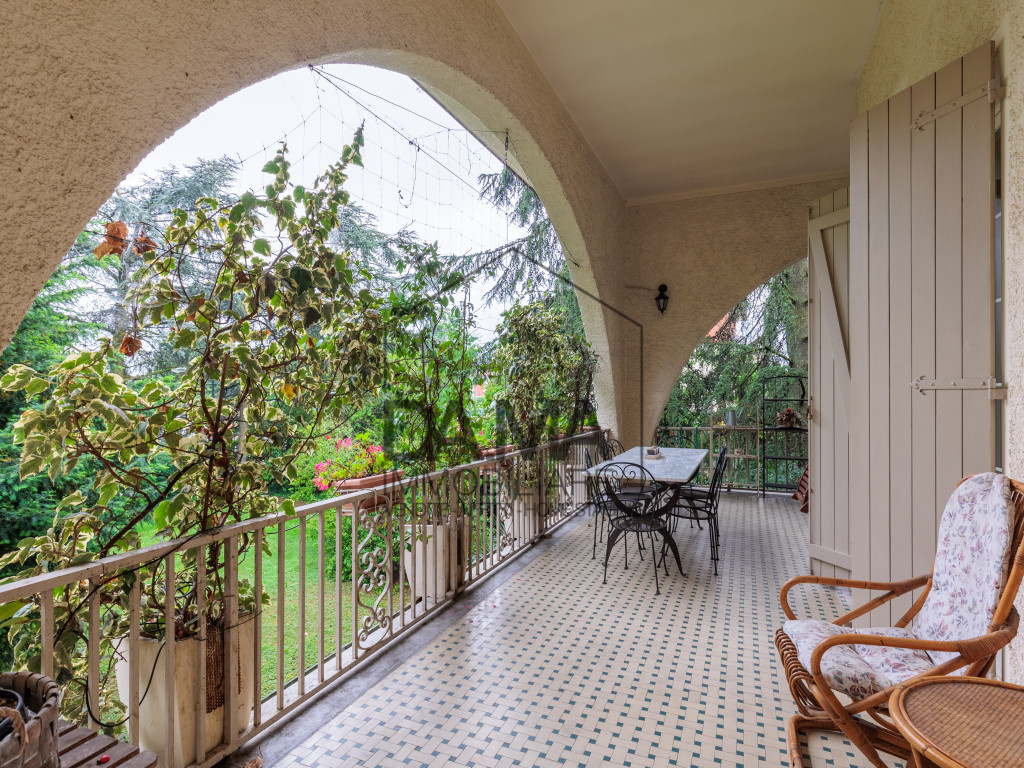 L’ingresso alla proprietà avviene attraverso una suggestiva scalinata che conduce a un elegante porticato affacciato sul giardino, perfetto per momenti di relax all’aperto.